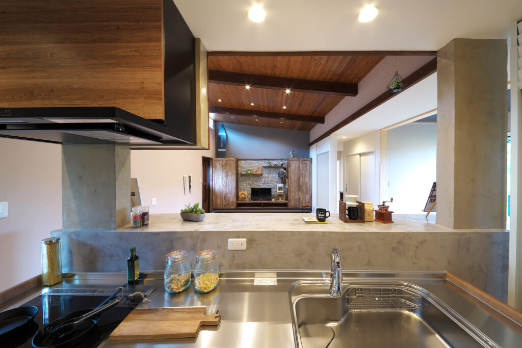 キッチンカウンターは男前なモルタルカウンターを設置しました。