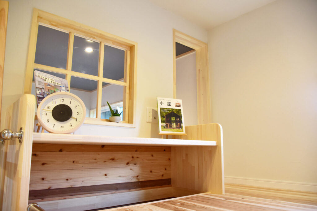 室内窓を通してリビングを見渡すことができるので、程よい巣籠り感と家族の気配を同時に感じられる、居心地の良いスペースになっています。