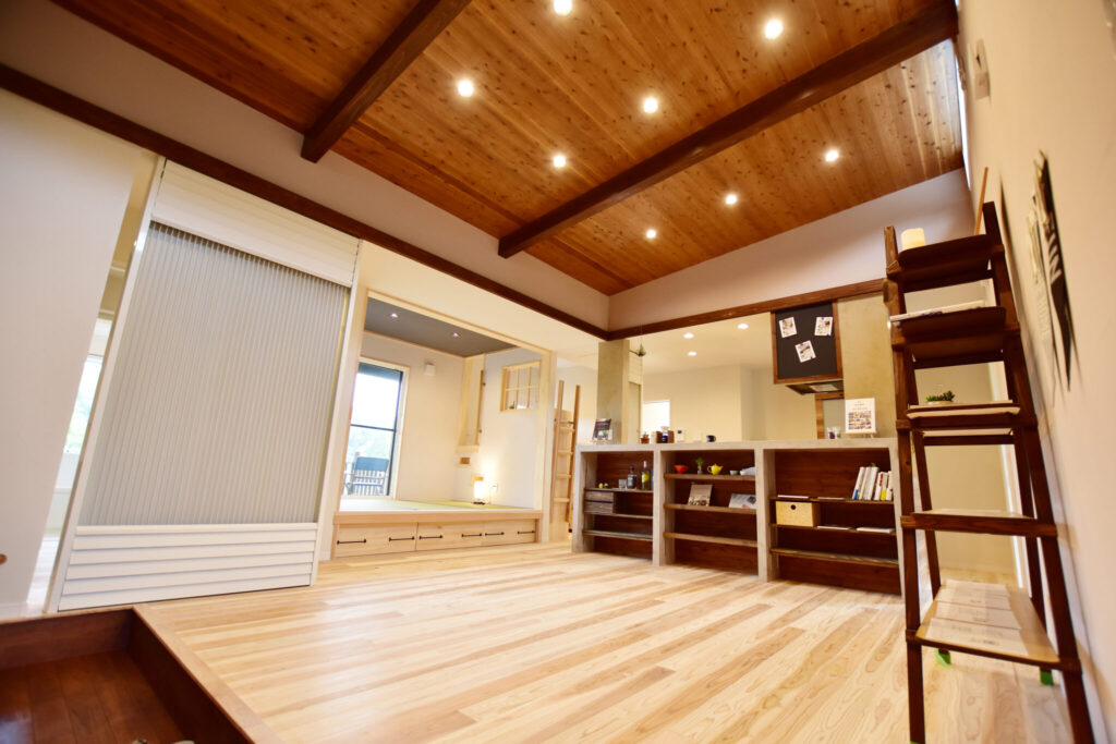 家族用玄関を開けると、目の前に勾配天井と窓からの景色で開放感あふれるリビングが。