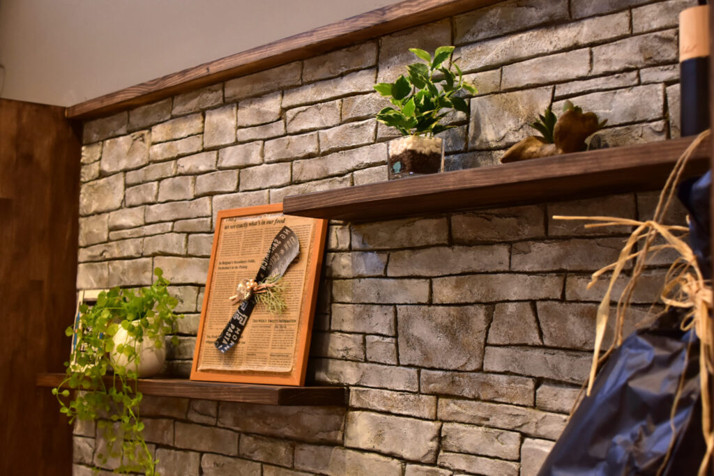 みんなの視線が集まるテレビボードはデザインコンクリートで石積み風に。