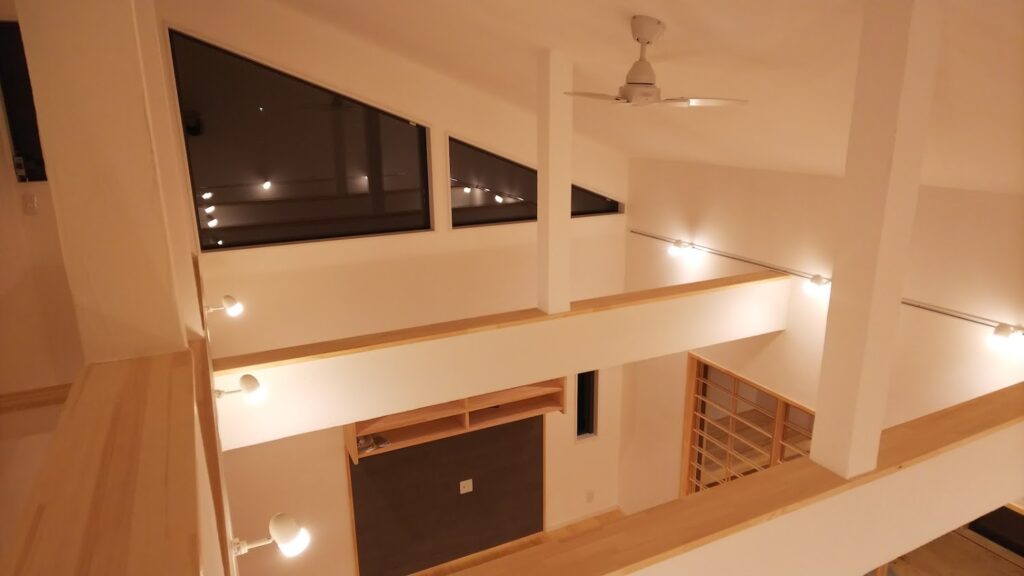 室内が明るいおうちを!とご希望されたこちらのお宅の特徴は、何といっても吹き抜けに取り付けた大きな三角の明り取り。