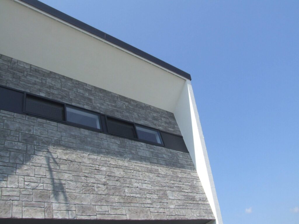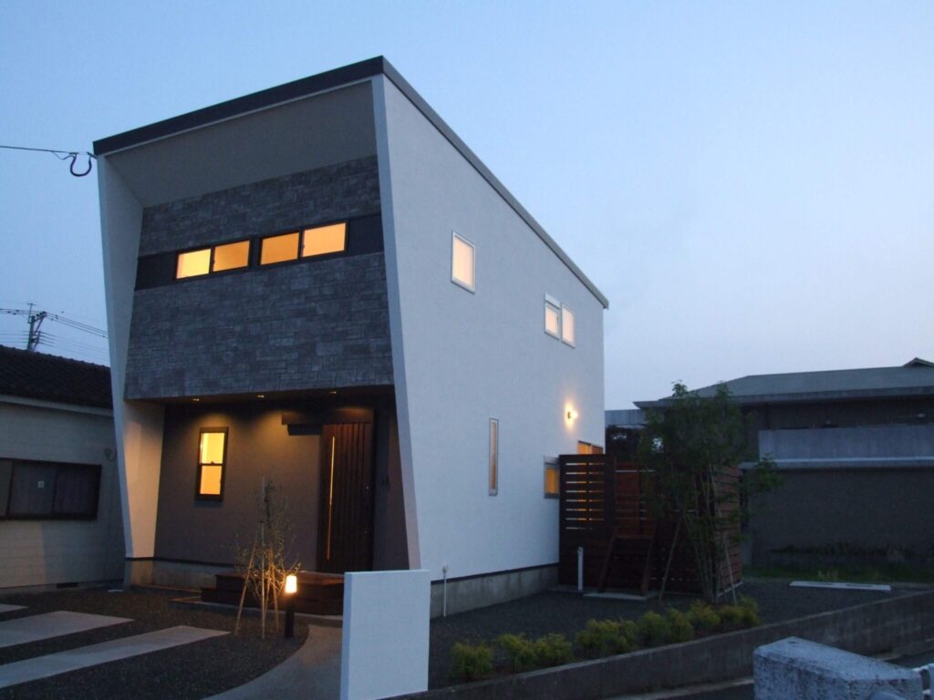 ありきたりでない、コンパクトでスタイリッシュな外観をご希望されたK様邸は、2階の床面積の方が広い作りを活かした斜めの壁が特徴的です。