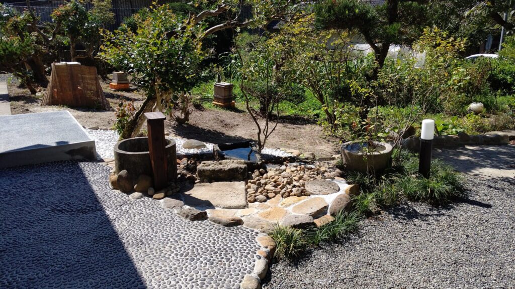 水面のゆらめきと、滴り落ちるしずくが奏でる琴のような音色が、心を落ち着けてくれると同時に、家の中に入るのを少し楽しみにしてくれます。