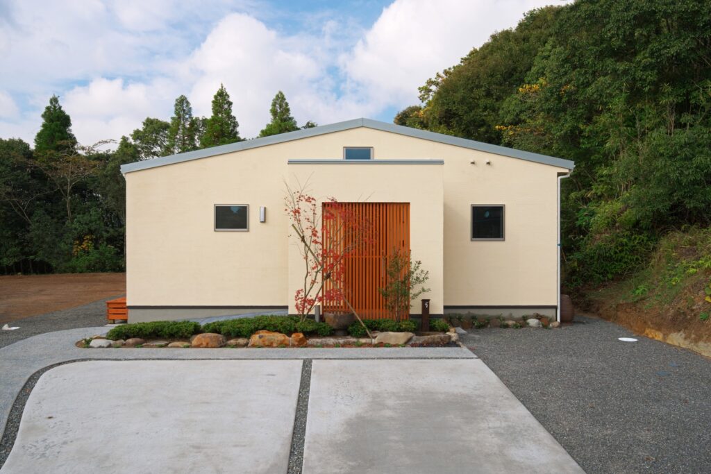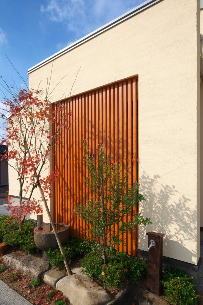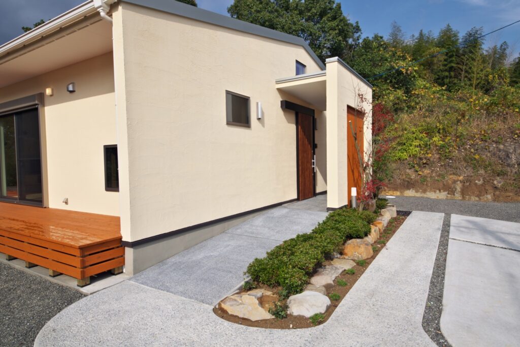 植栽とデザイン性を持たせた駐車場コンクリートで小道のように仕上げました。