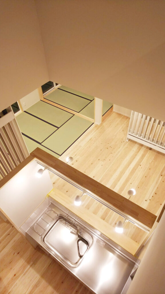 そして子供室がある2階からは吹き抜けを通してキッチンが見えるので、フロアは違っても建物全体を通じて、家族のつながりを感じことができます。