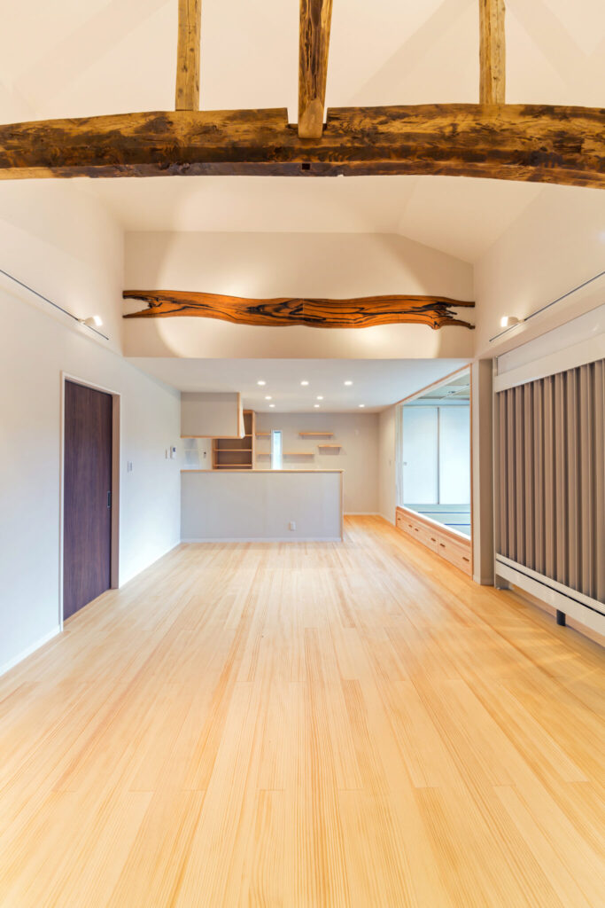 こちらのお宅の見どころは、吹き抜けの大きな古い梁と壁に埋め込まれた板。