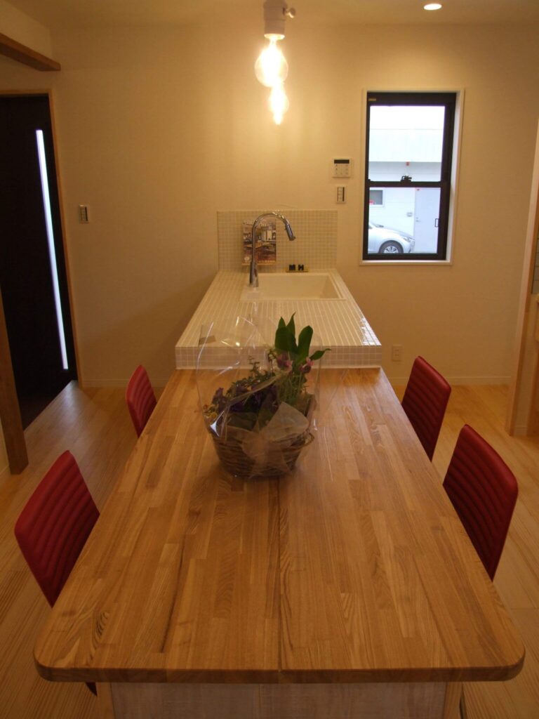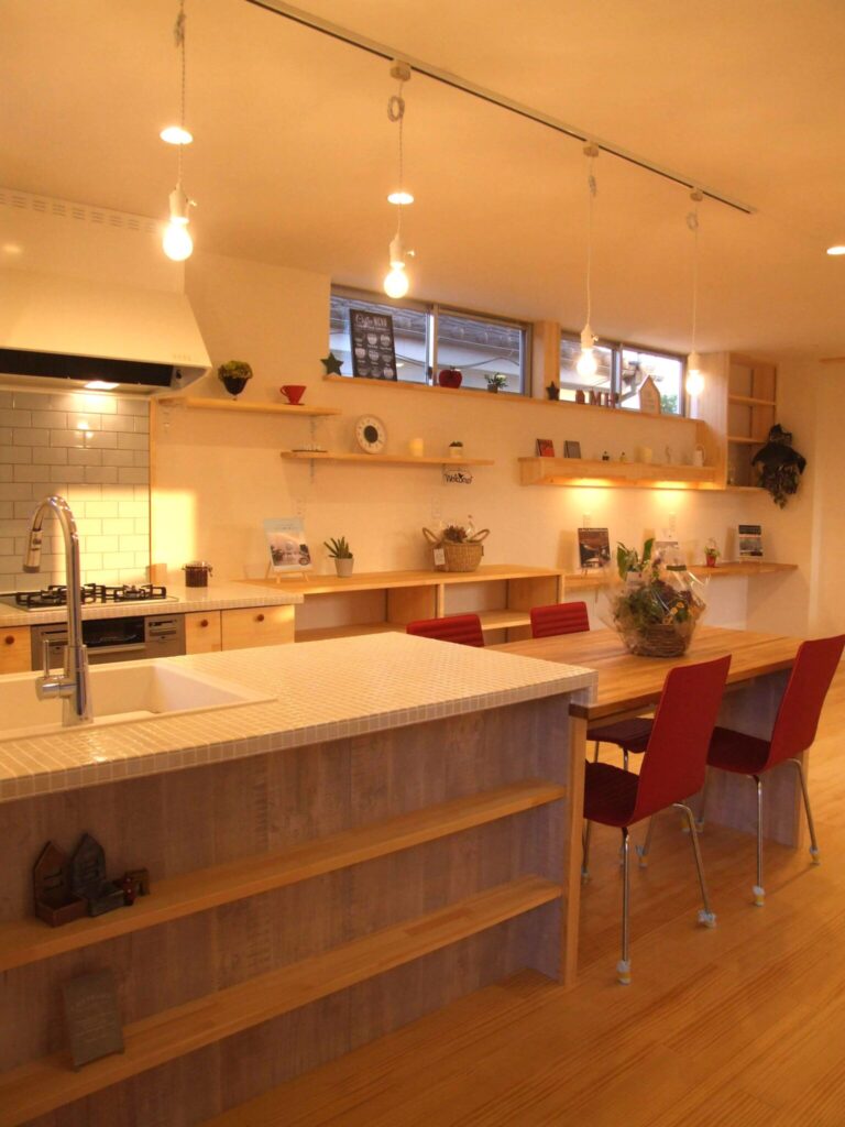 真っ白のタイル張りのキッチンは、もはやインテリアと言っても良いほどおしゃれで、まるでアットホームなカフェのよう。そこで、造作のダイニングテーブルとセットにして、玄関から入ってすぐに見える間取りへ。空間を無駄にすることなく、こだわって作ったものを全面的に押し出す理想の空間が出来上がりました。