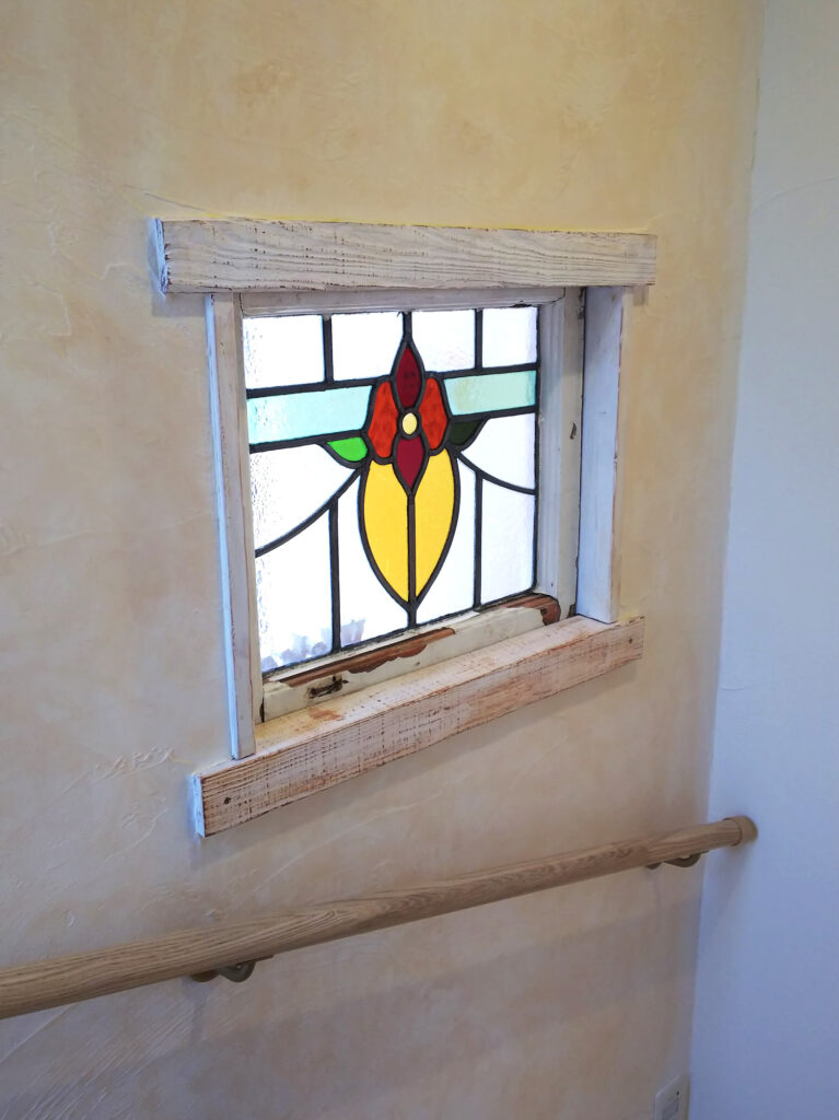 雑貨のディスプレイスペース、心地よい明るさの間接照明など。また、雑貨屋さんで買ってこられたステンドグラスを、玄関の裏に造作で取り付けました。アンティークの雰囲気を生かす、ヴィンテージな枠がポイントです。ご夫婦の好きな雰囲気を目いっぱいに詰め込んだ素敵なおうちに仕上がっています!