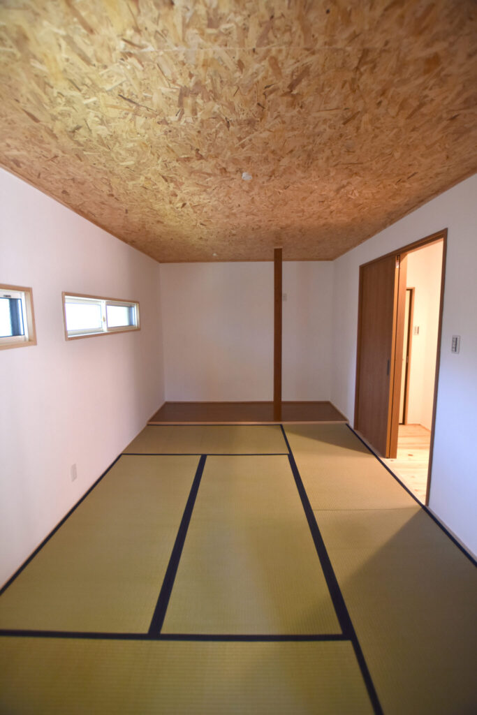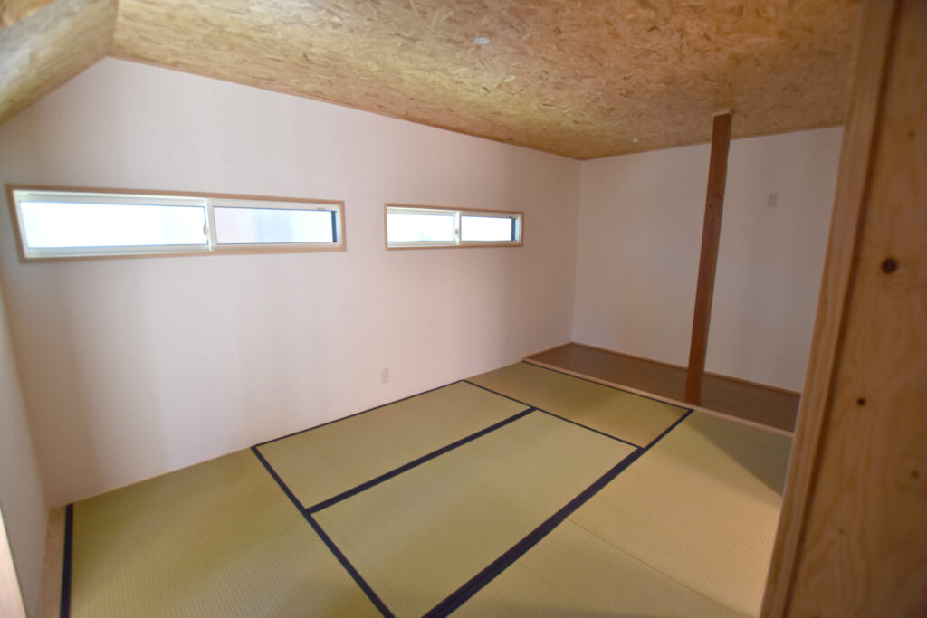 家族みんなでゴロゴロできる寝室。窓を小さく天井も低く、安心して巣籠出来るイメージです。