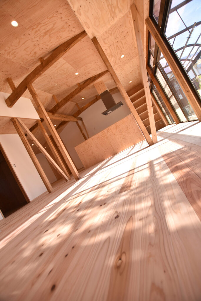 リビングの杉の無垢材の床には、お庭の木陰が美しく映ります。