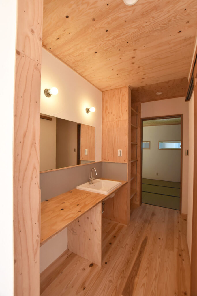 子どもさんが大きくなった時のことを考えて、みんなで横並びに支度ができるよう洗面スペースは横に広めに。