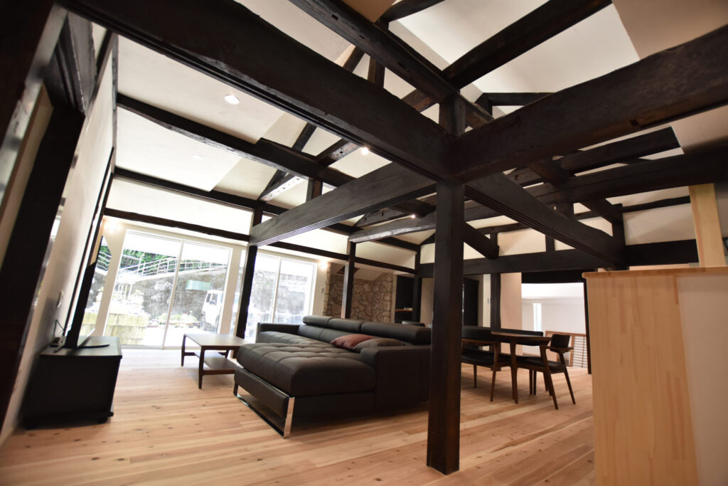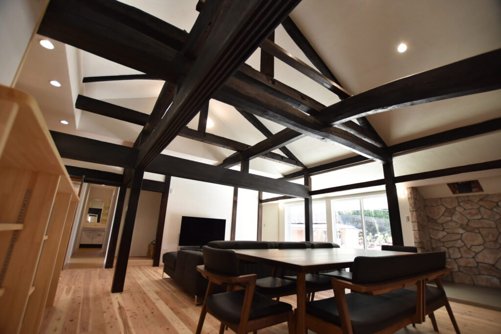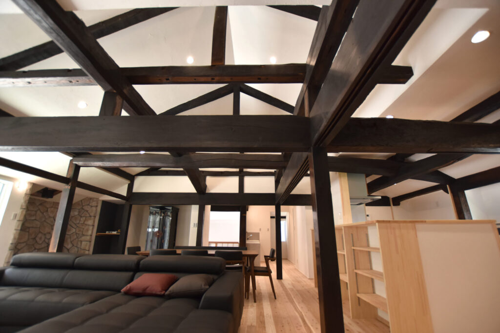 こちらのお宅のような太くて立派な梁は、今使用したいと思っても中々手に入りません。本来木材は製材されてから長い月日をかけて強度を増し、本当に朽ちてしまうのはず~っと先のお話。もちろん状態にもよりますから一概に言えることではありませんが、せっかくの良い素材は、構造材としても意匠としても大切に活かすのがベストです。