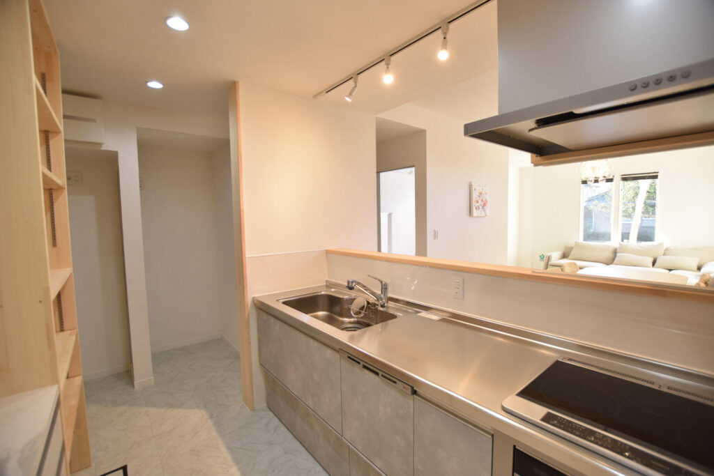 キッチンは元々別部屋でしたが、リビングダイニングを見渡せるよう仕切り壁を撤去しました。