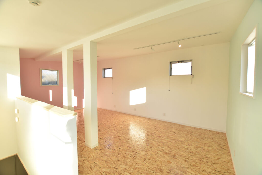 子ども部屋はほかの部屋とテイストを変えて、床材はカジュアルに、壁はポイントカラーを使い柔らかさを出しました。