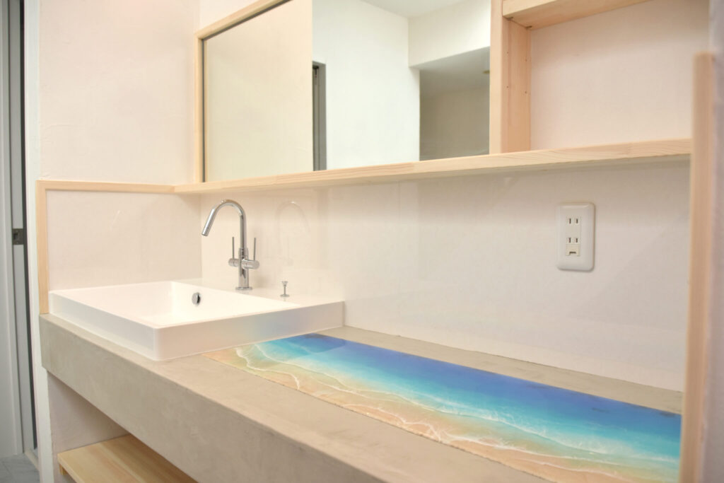 洗面台はお施主様のご要望で、オーシャンアートを天板に埋め込みました。アート周りはモルタル風のMPC仕上げに撥水加工を施してあります。