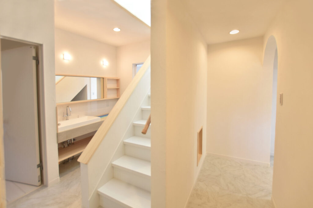 既存部と増築部の接続部周辺。白い階段に白い塗り壁とアーチ型の開口が、ちょっぴり地中海リゾートを思わせてくれます。同じ白でも光の加減で雰囲気が変わるところも楽しんでいただきたいです。