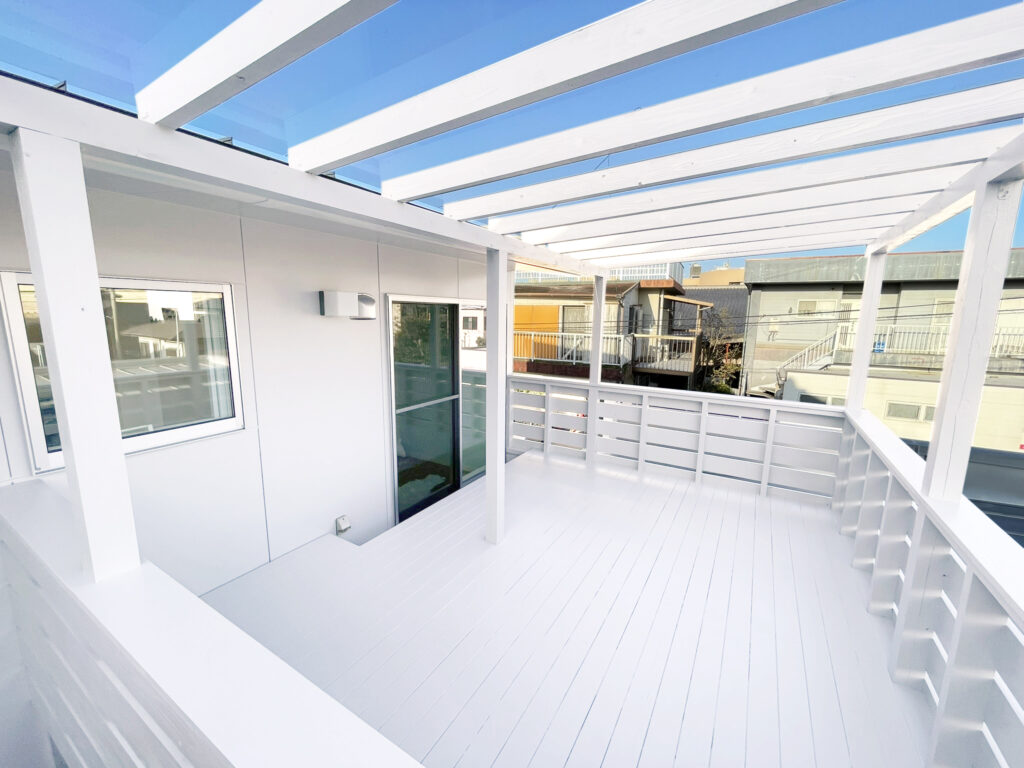 2階の白いウッドデッキが青空に映えますね。