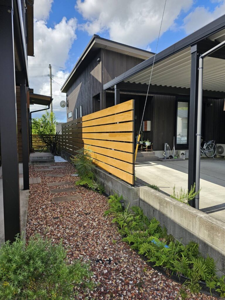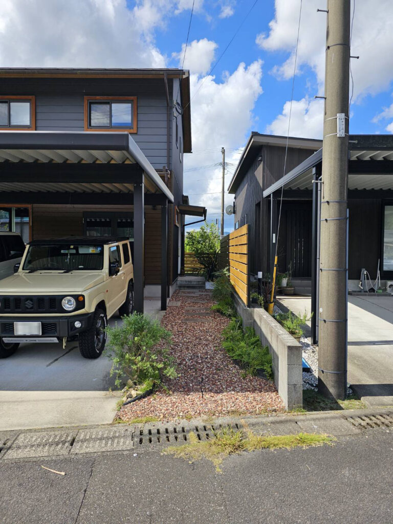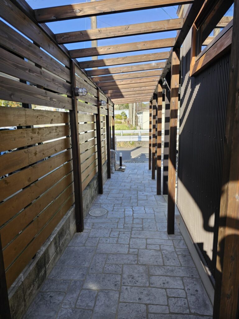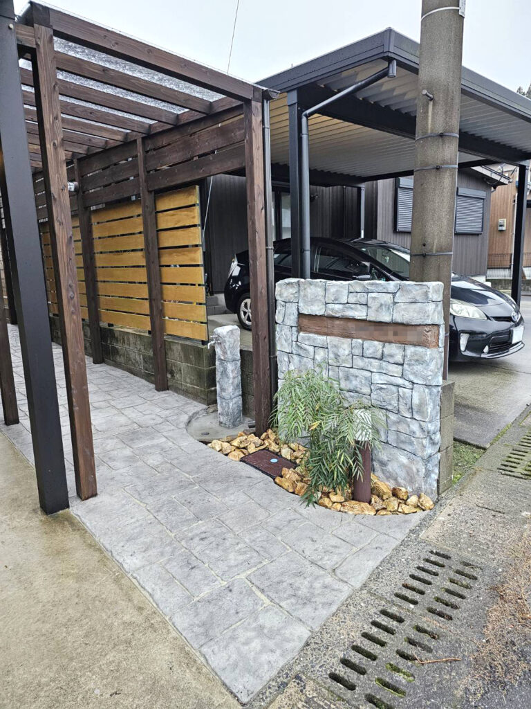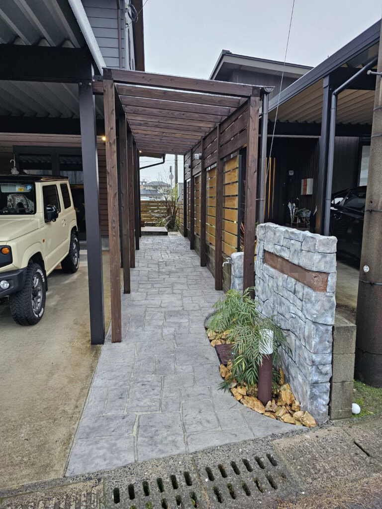数年前に新築で建てられたおしゃれなお宅。玄関が通りから奥まっていてわかりづらいことと、雨天時にカーポートと行き来する際に濡れてしまうというお悩みから、アプローチ施工をご相談いただきました。