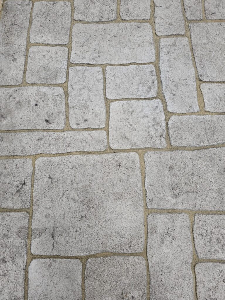 玄関へと続く足元は、同じくデザインコンクリートの「オーバーレイ」という技術で石畳風に仕上げました。