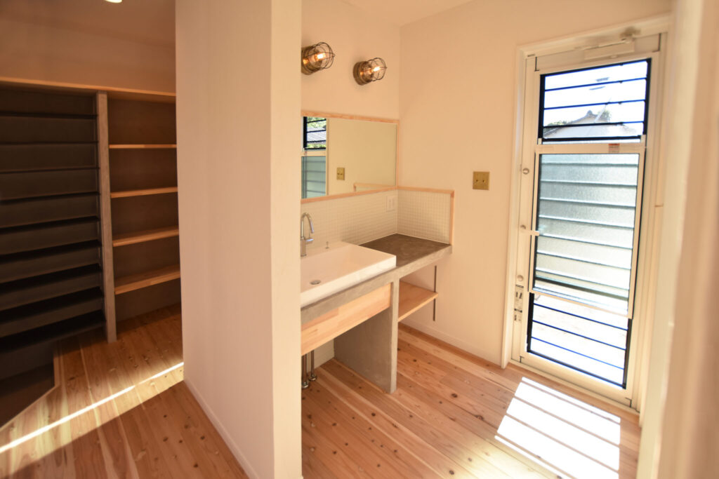 玄関横のシュークロークから洗面台、お風呂場へは一直線。ご家族でアウトドアを楽しんだ後や子どもさんの部活帰りなど、汗まみれ泥んこまみれでも最短距離の動線で終わらせます。