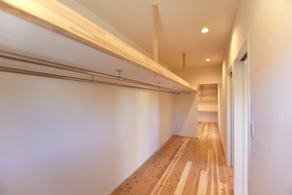 杜ノ輝は基本的に収納スペースを必要以上にとることはおススメしていませんが、今後のライフステージを見据えて、必要であればあらかじめ確保するようにしています。こちらの宅ですとモノが増えなければ増えないで、そのままフリースペースとしてゆとりある活用をしていただくこともできますね。