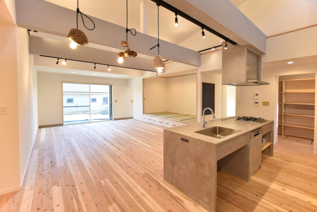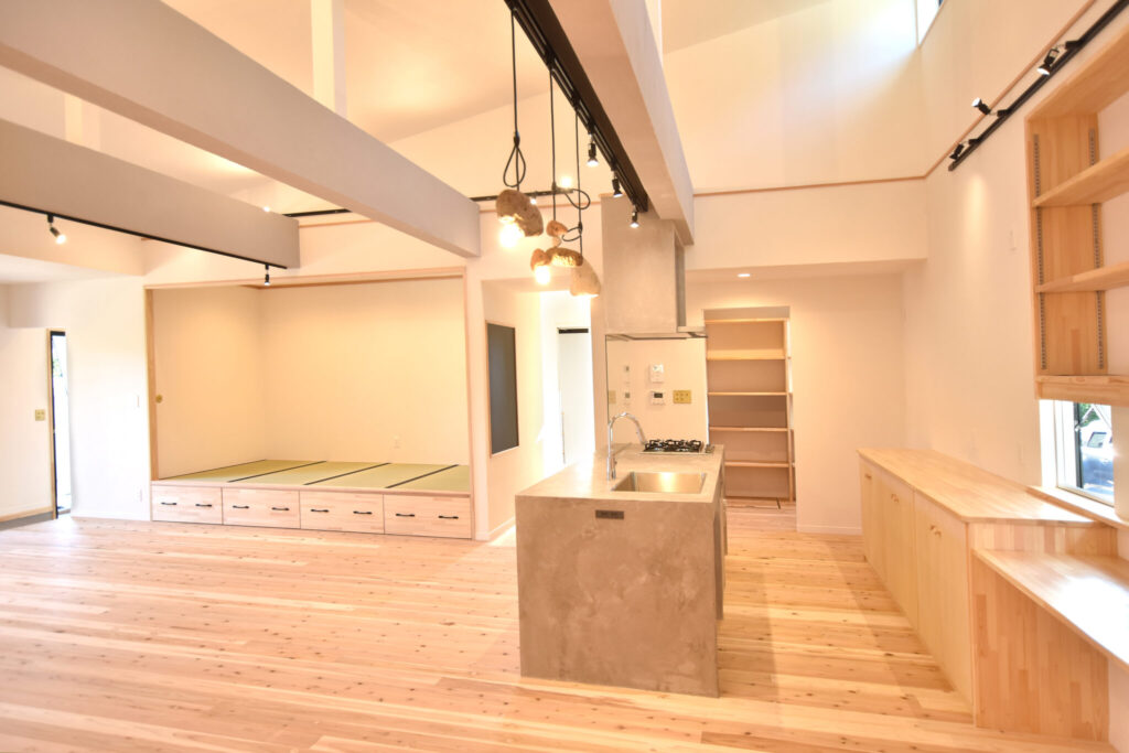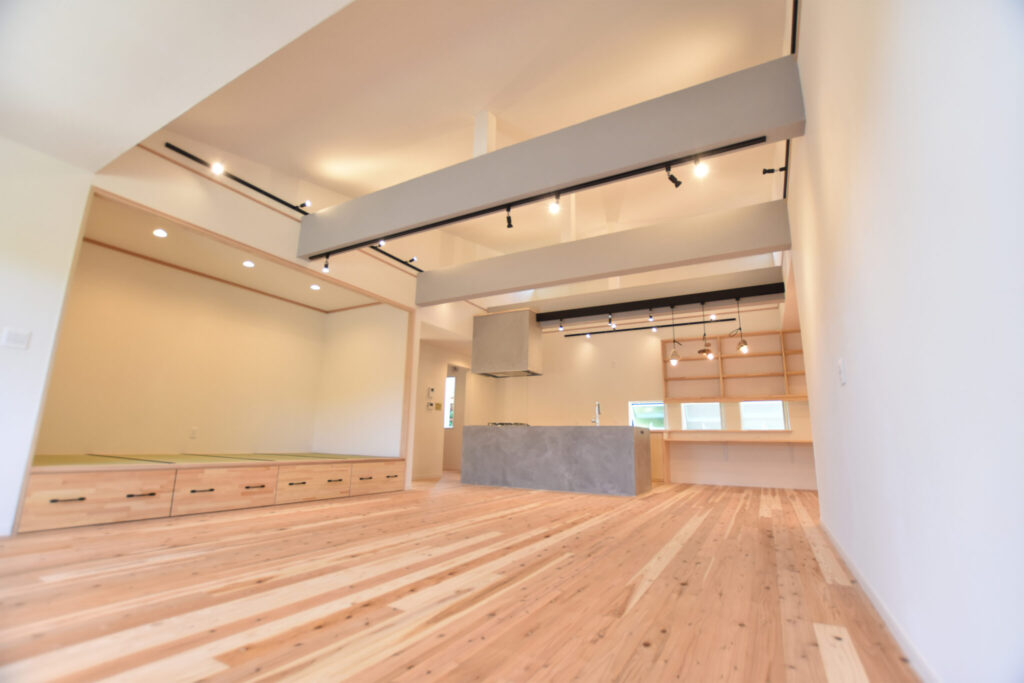 LDKは間取りの広さだけでなく、勾配天井で高さも出しましたので解放感抜群。大人数で集まっても圧迫感を感じません。