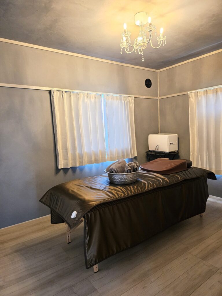 サロンのようなおしゃれでちょっと高級感のある雰囲気をご希望されていましたので、壁をグレーに。天井も貼りなおしてグレーに仕上げました。敢えて塗りむらをつけることで空間に趣が出てきます。和室ならではの長押も、窓枠と合わせて白くペイントすることでよいアクセントになりましたね。