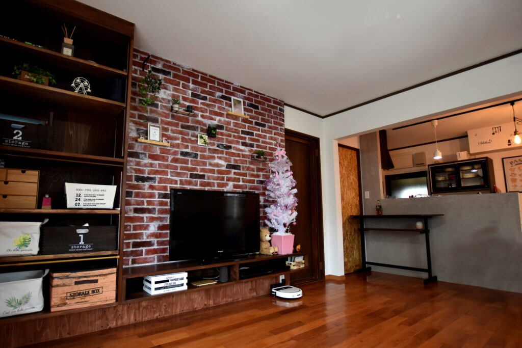 リビングの壁のうち1面だけ、レンガ壁でブルックリンスタイルに。テレビボードや棚もそれに合わせておつくりしました。