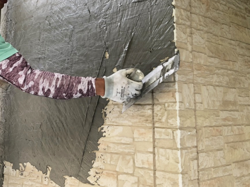 既存の壁や凸凹面の上からも使用できる下地材を使用して、塗り壁に仕上げました。