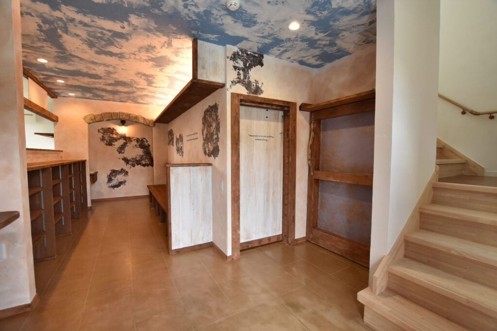 石貼り風の床に、こだわりのアーチ型スウィングドア。