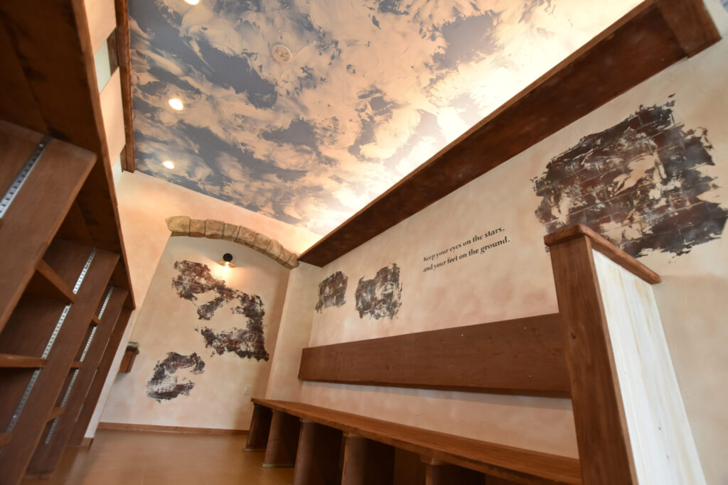 古びた漆喰と石のアーチが特徴的な待合室。天井には、空。