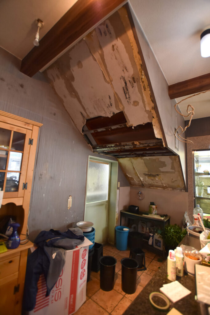 リノベ前もパッと見では気づきませんが、お花を移動させると、壁や階段下など、店内のあちこちが湿気で傷んでいるのがわかります。