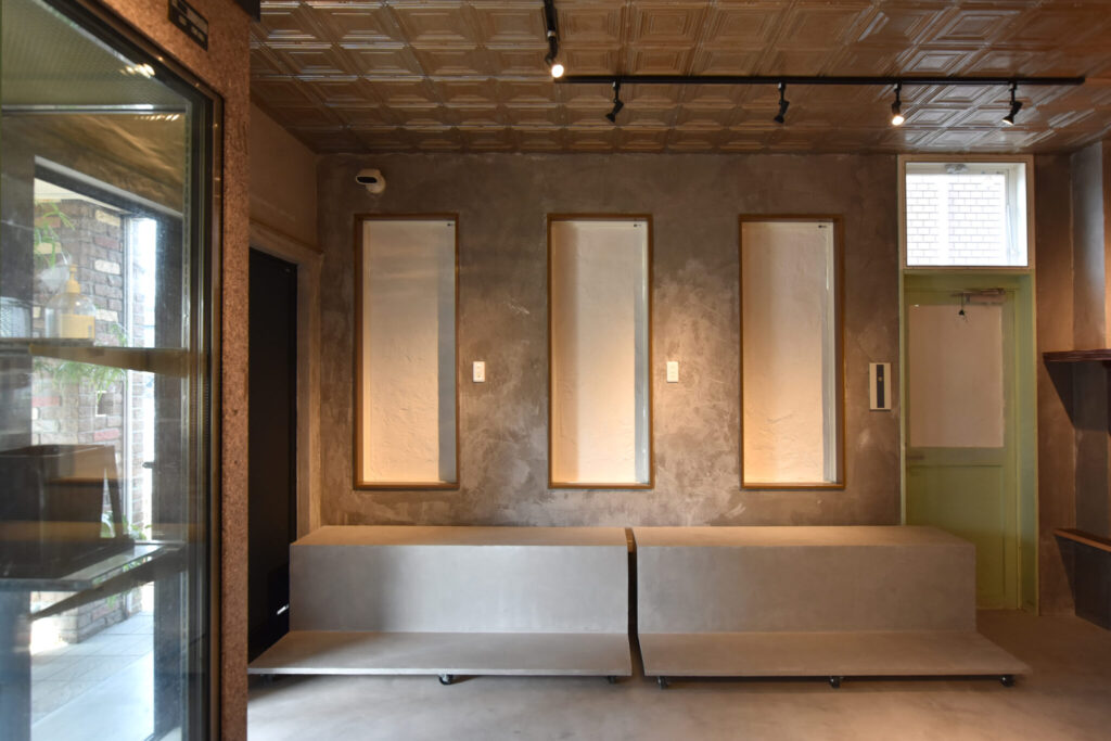 壁と床はデザインコンクリートの一種で、コンクリート打ちっ放しのような質感で仕上げられるMPCを使用し、塗りの段階からモルタルの色むらが強調されるよう意識しました。