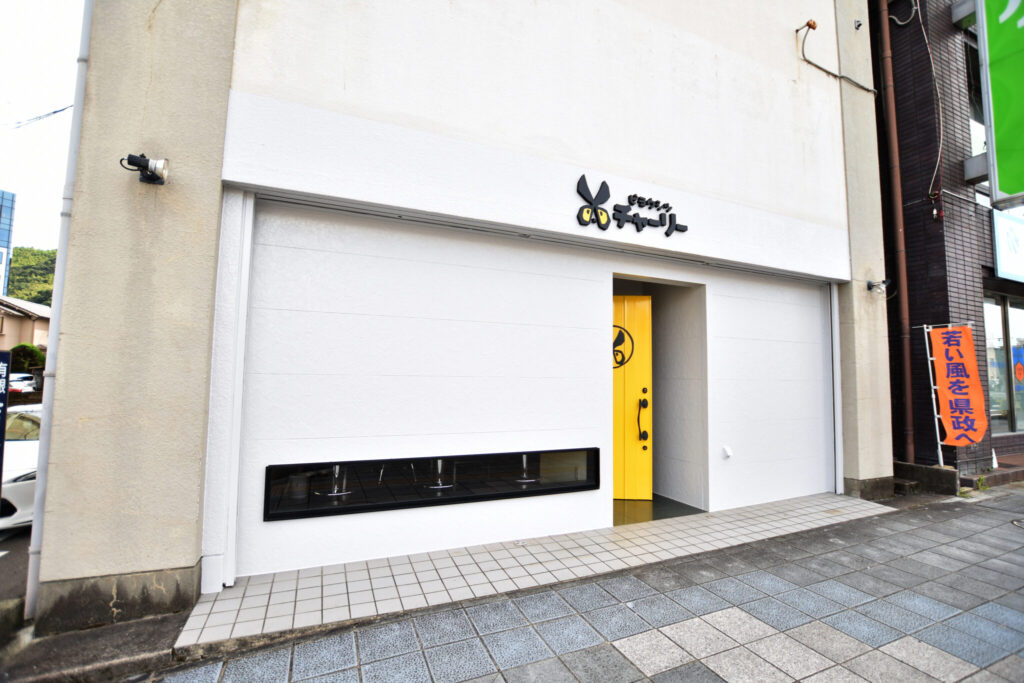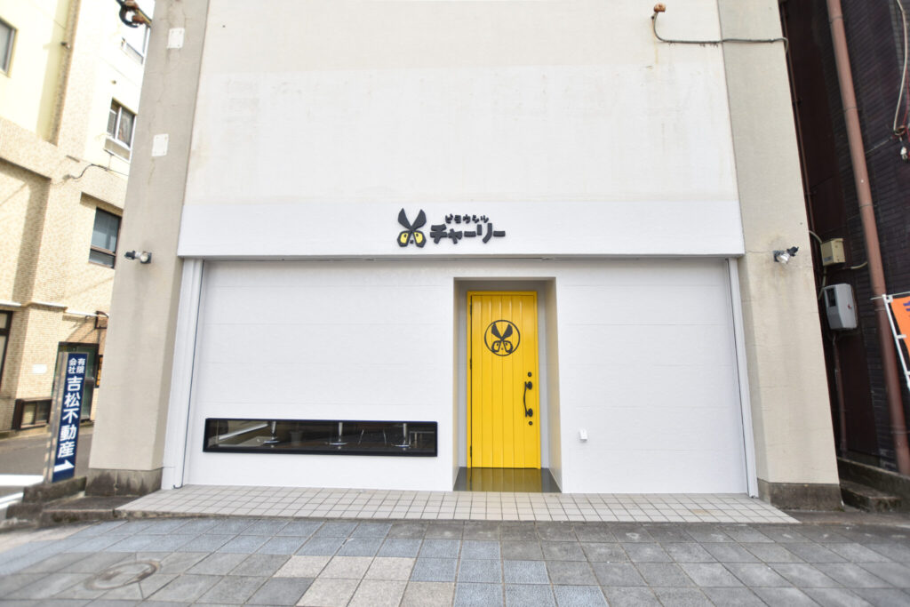 外壁は薄いグレーで爽やかな印象に。以前の黒い外観も素敵だったのですが、新店舗のトレードマークが黄色い扉であることと、ビヨウシツチャーリー様の柔らかく親しみやすい雰囲気が伝わりやすくするために塗り替えました。