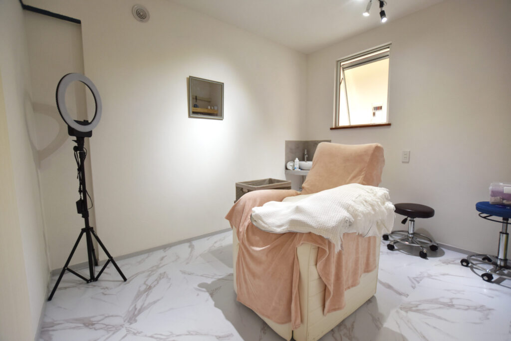 施術室はガラッと雰囲気を変えて、白を基調としたシンプルな空間。お肌の状態や施術の仕上がりがわかりやすいですね。