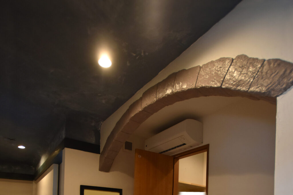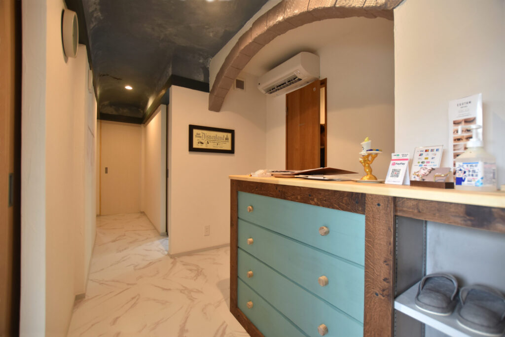 今回Lapis様の建物の特徴は、なんといってもデザインコンクリート。外観だけでなくサロン内にも随所に採用しています。デザインコンクリートはモルタルを自由に造形して着色することで空間をつくり上げる技術ですので、本物そっくりのレンガや石畳をつくることもできますし、自由なイメージを形にすることもできます。既製品ではない唯一無二の空間づくりにはうってつけですね。