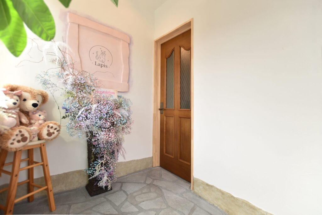 ドアを開けるとロゴマークの猫ちゃんがお出迎え。
