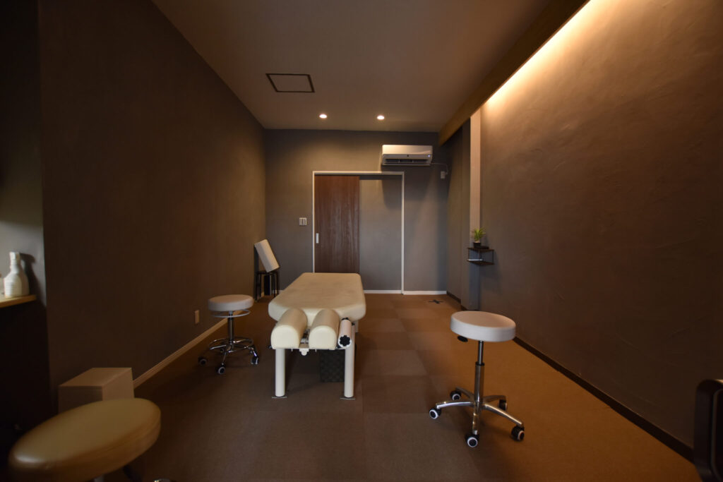 奥の施術室は照明控えめに、シンプルな空間になるよう心がけました。来院された方がより深くリラックスして、施術に集中していただくことを狙いにしています。